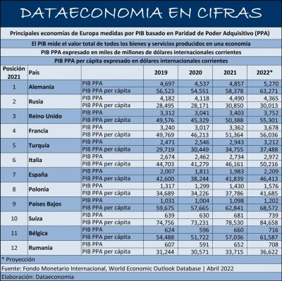 Evolución PIB basado en Paridad de Poder Adquisitivo de economías seleccionadas de Europa